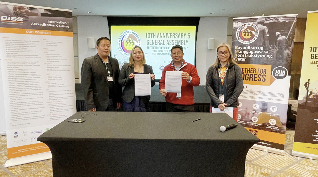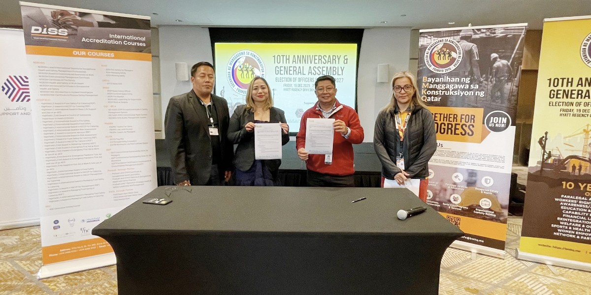 DOHA, 19 Dec 2025 — In a significant move to strengthen professional development opportunities for Filipino workers in Qatar, the Bayanihan ng mga Manggagawa sa Konstruksiyon ng Qatar (BMKQ) formally signed a partnership agreement with DISS, one of the country’s leading providers of Health, Safety and Environment (HSE) and Management Training.